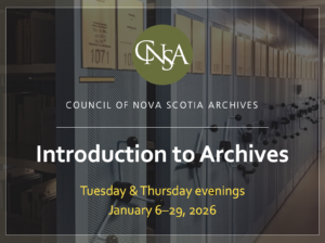 Registration: Open to all! Course Dates: every Tuesday & Thursday evening from January 6–29, from 5:30–7:30 p.m (Atlantic) Where: Online via Zoom & Google Classroom Instructor: Sharon Murray, the CNSA’s Archives Advisor Course Description Introduction to Archives provides an overview of archives and archival practice. By the end of the course, participants should be able to distinguish archival records from other types of records, recognize common risks to preserving archival materials, know what a fonds is an how it’s organized, plus have a basic understanding of the seven core archival functions: acquisition, accessioning, appraisal, arrangement, description, and access & reference. This course is part of…